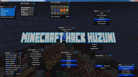 Minecraft hacked client 1.7.2. In game commands : Y GUI U Console. Minecraft 1.7.4 Hacked Client n 1. Keybinds:Right Shift GUI Install Go to "appdata" Open ".minecraft" Open "versions" Create a folder and call it "huzuni" Extract the huzuni.zip Put in the "huzuni.jar"...
